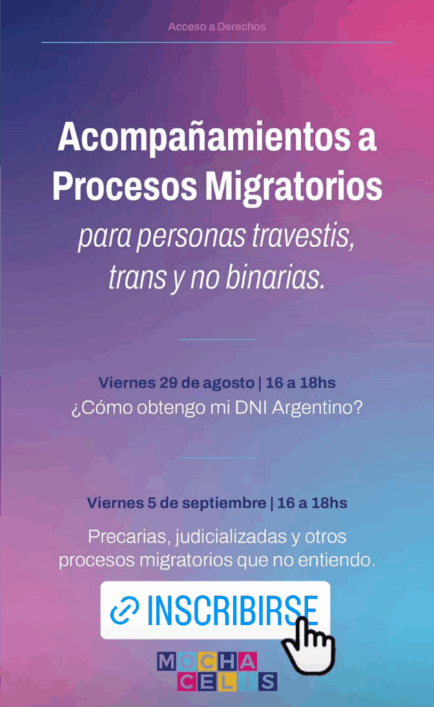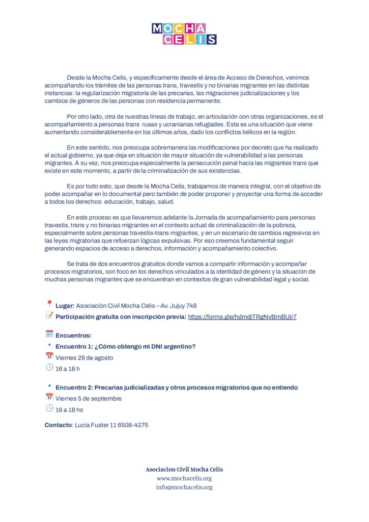 La Asociación Civil Mocha Celis, a través del área de Acceso a Derechos –que se dedica, entre otras cosas, al acompañamiento en los trámites de regularización migratoria a personas trans, travestis y no binarias en Argentina– organizó una serie de encuentros informativos en la sede de la institución, Avenida Jujuy 748.