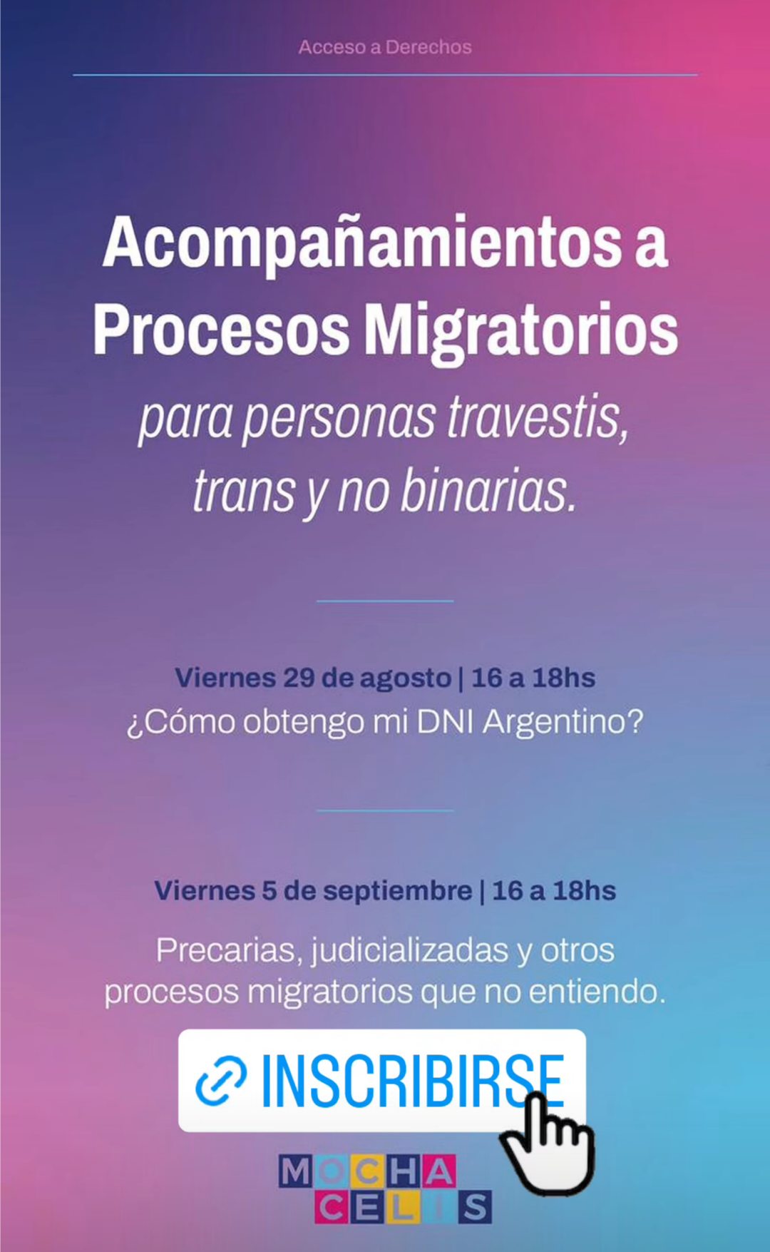 La Asociación Civil Mocha Celis, a través del área de Acceso a Derechos –que se dedica, entre otras cosas, al acompañamiento en los trámites de regularización migratoria a personas trans, travestis y no binarias en Argentina– organizó una serie de encuentros informativos en la sede de la institución, Avenida Jujuy 748.