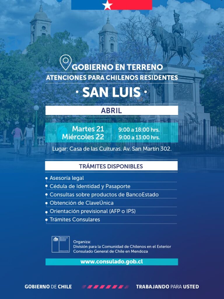 La División para la Comunidad de Chilenos en el exterior y el Consulado General de Chile en Mendoza llevarán adelante un operativo destinado a la población migrante que reside en San Luis. Entre los trámites se podrá solicitar la renovación de cédulas, el cambio de domicilio electoral y ciudadanía para hijos o nietos de chilenos en la Argentina. También habrá asesoría legal para consultar sobre temas como la jubilación y las pensiones.